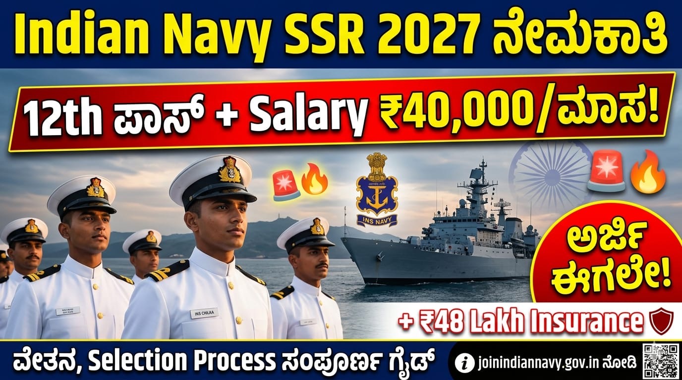 Indian Navy Agniveer SSR 2027 ನೇಮಕಾತಿ ಯುವ ಅಭ್ಯರ್ಥಿಗಳಿಗೆ ಅದ್ಭುತ ಅವಕಾಶ. 10+2 (Physics & Maths) ಅಥವಾ Engineering Diploma ಪಾಸ್ ಮಾಡಿದ ಅಭ್ಯರ್ಥಿಗಳು ಅರ್ಜಿ ಹಾಕಬಹುದು. ವೇತನ ಆರಂಭ ₹30,000/ಮಾಸದಿಂದ 4ನೇ ವರ್ಷದಲ್ಲಿ ₹40,000/ಮಾಸ, ಜೊತೆಗೆ ₹48 ಲಕ್ಷ Life Insurance ಲಭ್ಯ.