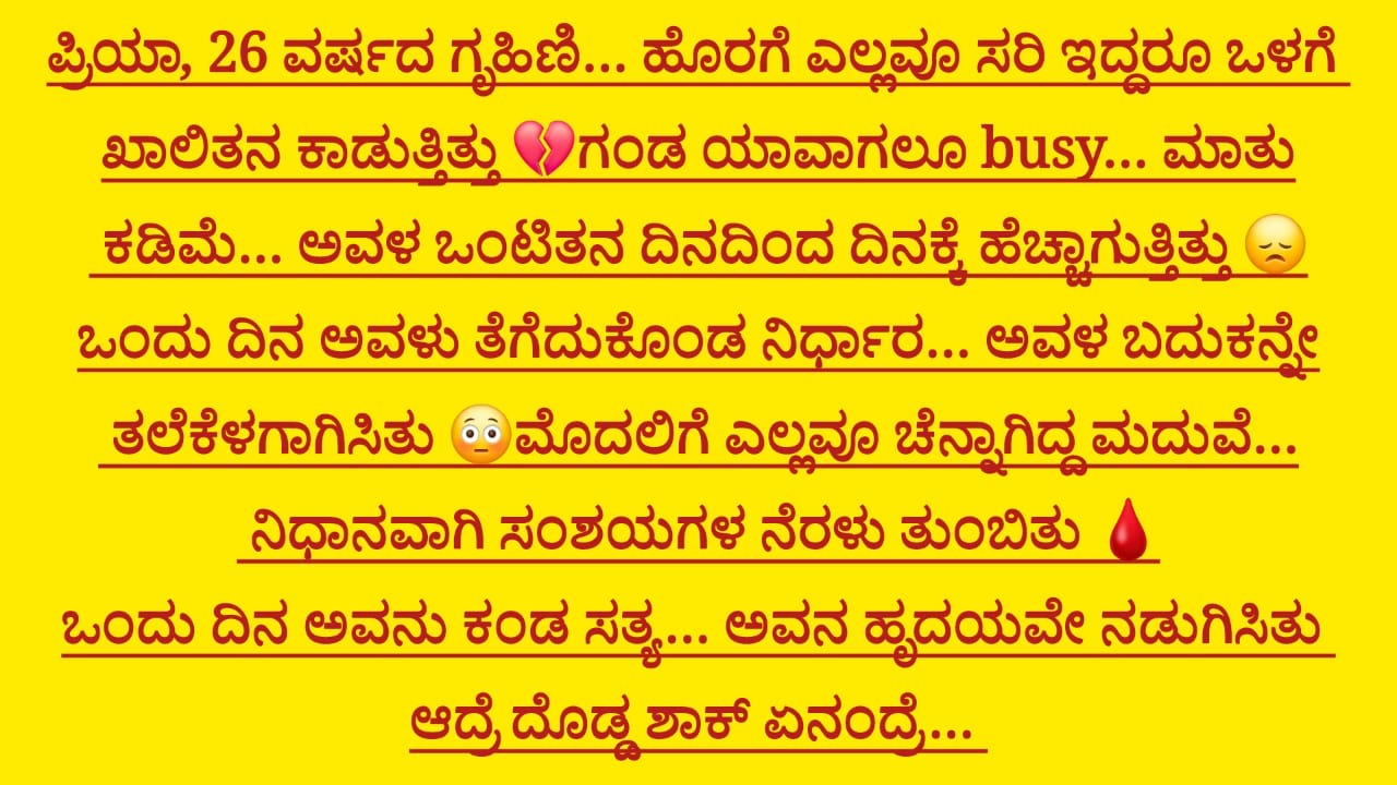 ಆ ಸಮಯದಲ್ಲಿ ನನ್ನ ಮನಸ್ಸಿನಲ್ಲಿ ಒಂದು ವಿಚಾರ ಸ್ಪಷ್ಟವಾಗುತ್ತಾ ಬಂತು — ಈ ಮನೆಯಲ್ಲೇ ಏನೋ ಸರಿಯಿಲ್ಲ. ನಾನು ಮಾತ್ರ ತಪ್ಪು ಮಾಡ್ತಿಲ್ಲ… ಎಲ್ಲರೂ ಏನೋ ಮರೆಮಾಚ್ತಿದ್ದಾರೆ ಅನ್ನೋ ಅನುಮಾನ ಹೆಚ್ಚಾಗುತ್ತಿತ್ತು.